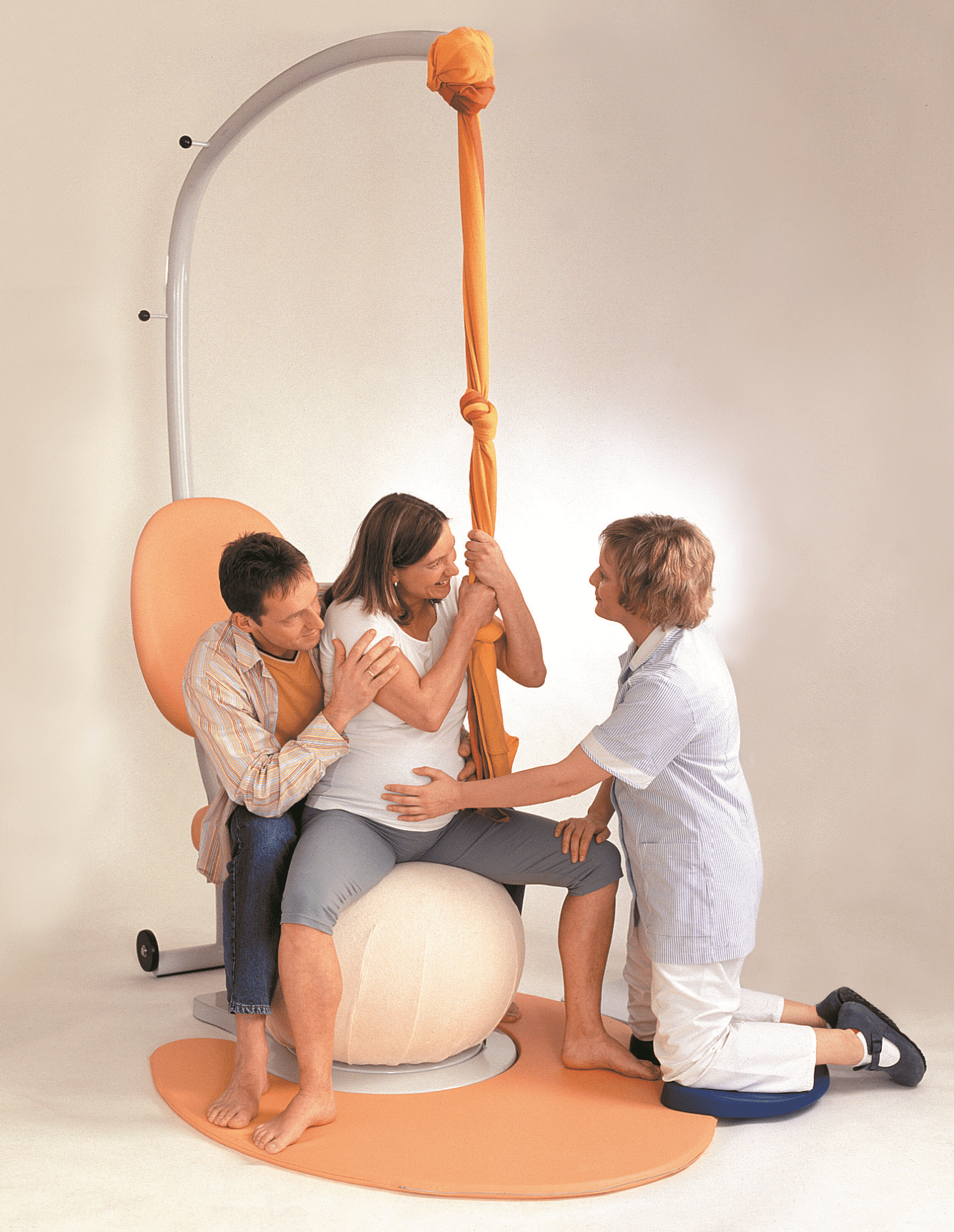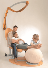 Mothers benefit from the support rope, which enables vertical birth positions that harness gravity for a faster and more natural delivery. The included PELVIBALL® base plate stabilizes movement, helping to relax the pelvic floor while maintaining safety. A padded backrest and ergonomic partner seat ensure both mother and partner remain supported throughout labour.