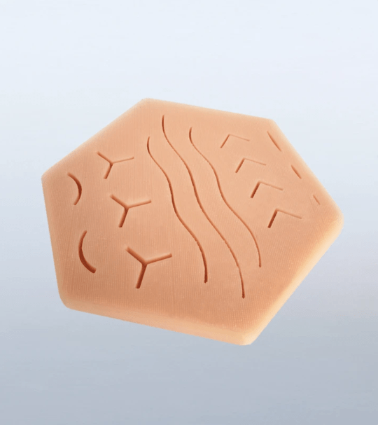 The Suturing Rehearsal Pad is designed to provide medical trainees with an opportunity to advance their suturing skills prior to patient care. Suturing pad measures approx 5" and is available in various skin tones.